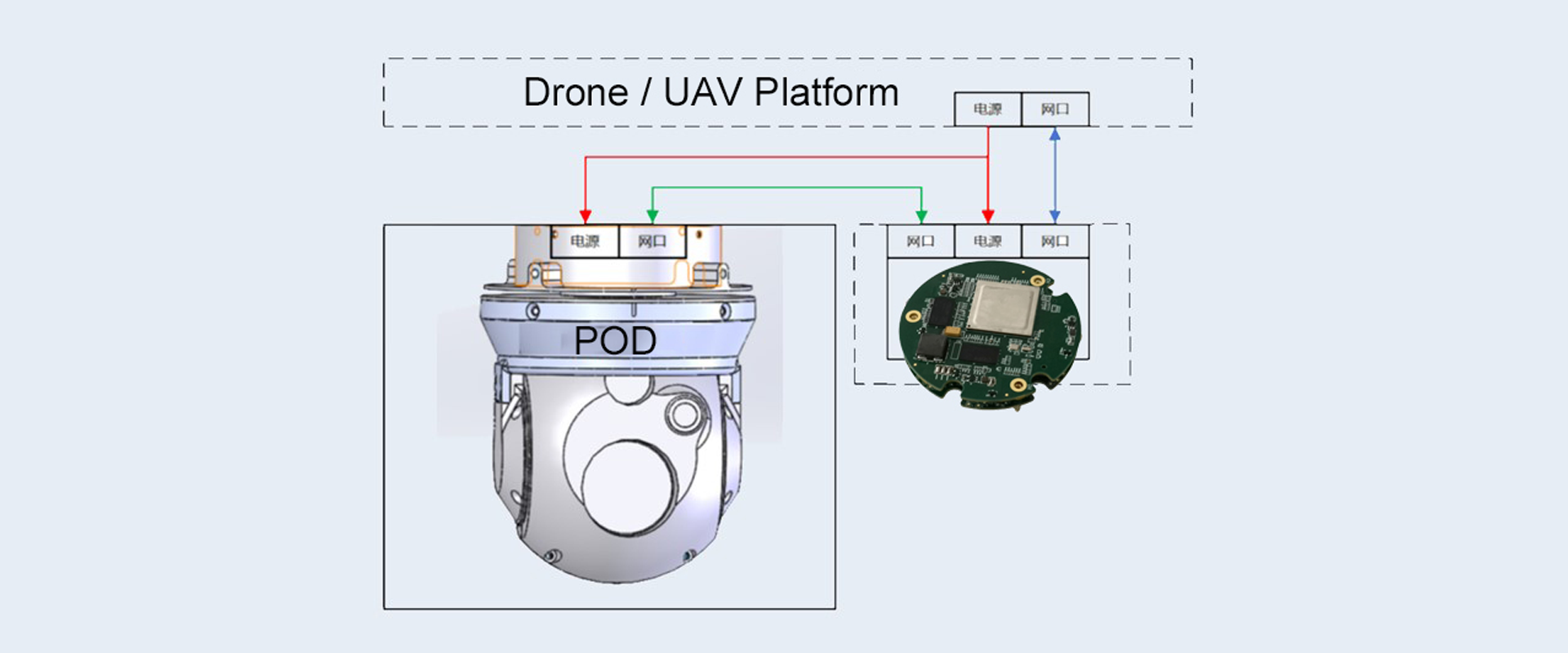 The pod adopts a two-axis spherical structural design, mainly including:Stabilized platform (two-axis structural frame, azimuth encoder, azimuth motor, pitch encoder, pitch motor, gyroscope, slip ring, servo control board), Visible light camera, Infrared thermal imager, Laser rangefinder.
