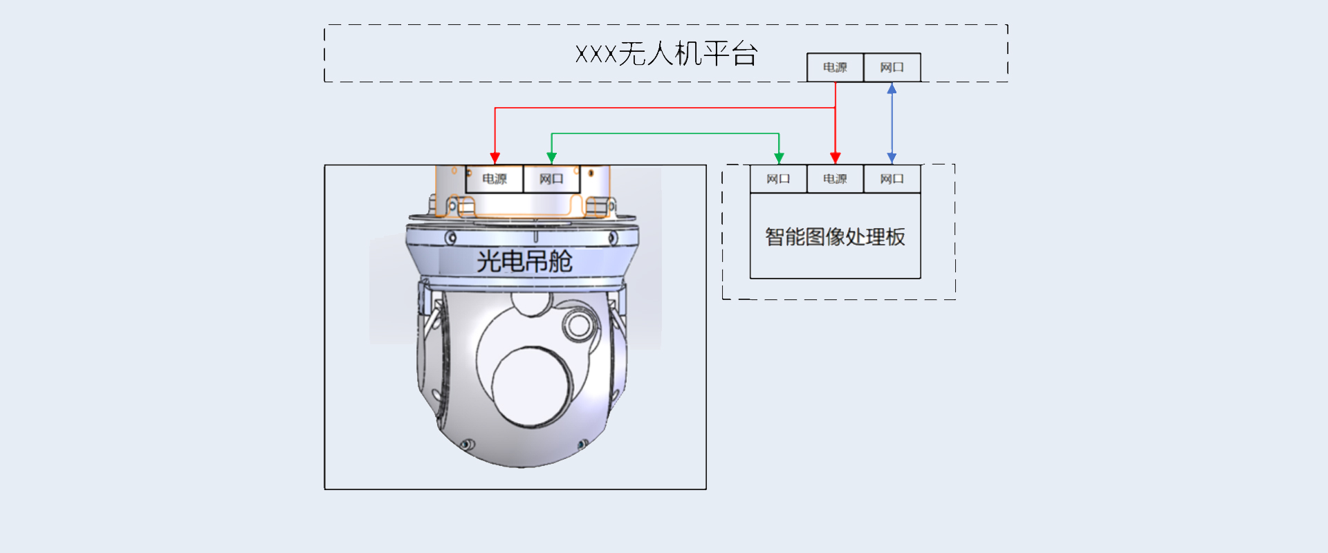 智能光电搜跟系统主要由光电吊舱和智能图像处理板组成(以下简称“图像板”)。光电吊舱采用两轴球型结构设计,主要由稳定平台(两轴结构框架、方位编码器、方位电机、俯仰编码器、俯仰电机、陀螺、滑环、伺服控制板)、可见光相机、红外热像仪、激光测距机等组成;智能图像处理板外置与光电吊舱球体外部,通过网络线缆与光电吊舱进行数据连接。